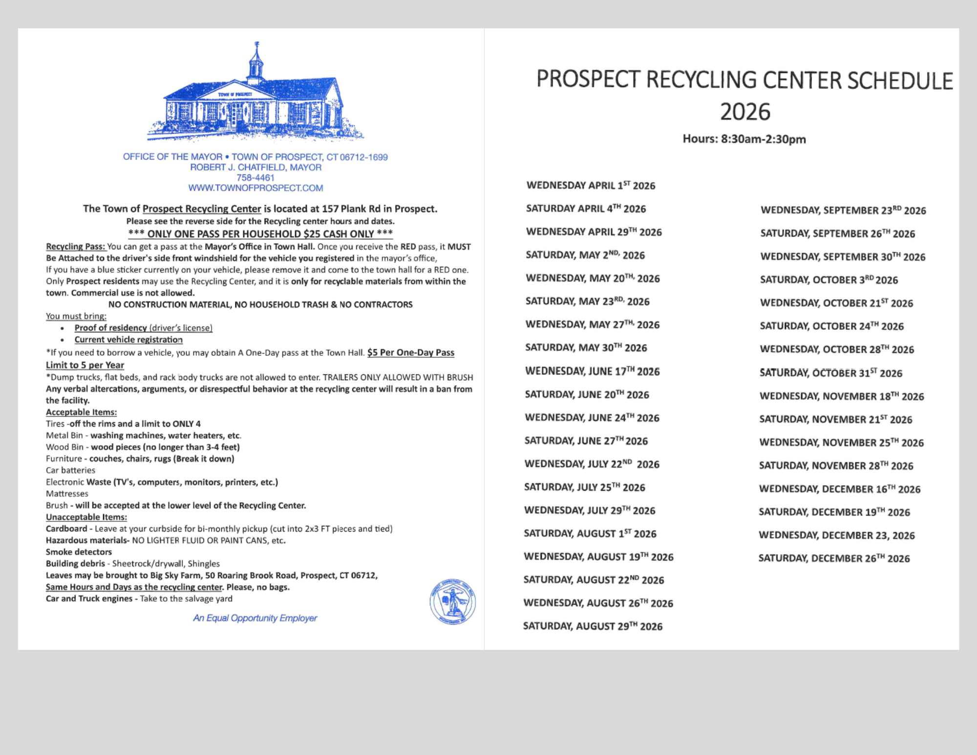 If you would like to contact us, or are interested in learning more about the Town of Prospect, call the Mayor's Office at (203) 758-4461, visit us at the Town Hall, 36 Center Street, or email us at Email the Mayor's Office.