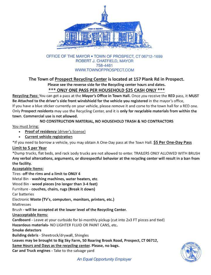 New stickers will be available starting Thursday, March 26, 2026, at the Mayor’s Office. To obtain your 2026 recycling pass, please bring $25 (cash only), your valid driver’s license, and the registration for the vehicle you will be using.