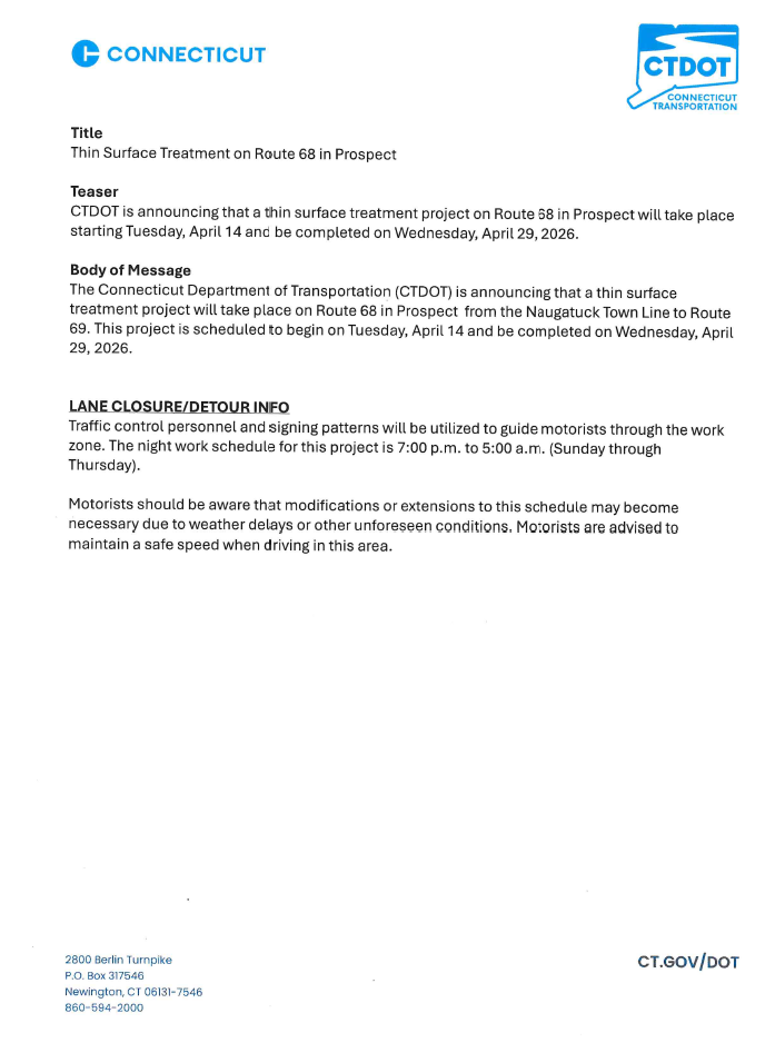 Annual Household Waste &; Paint Collection: Please remember that our Annual Household Waste and Paint Collection is happening this Saturday, April 18th, 2026, from 9:00 am - 2:00 pm at Crosby High School Route 68 Road Work in Prospect: Spring Fling: